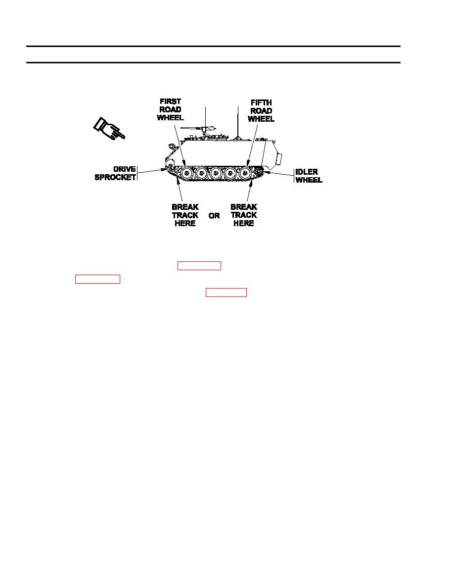 Drive carrier slowly so the track pin to be removed is about halfway between the first road wheel and the sprocket wheel